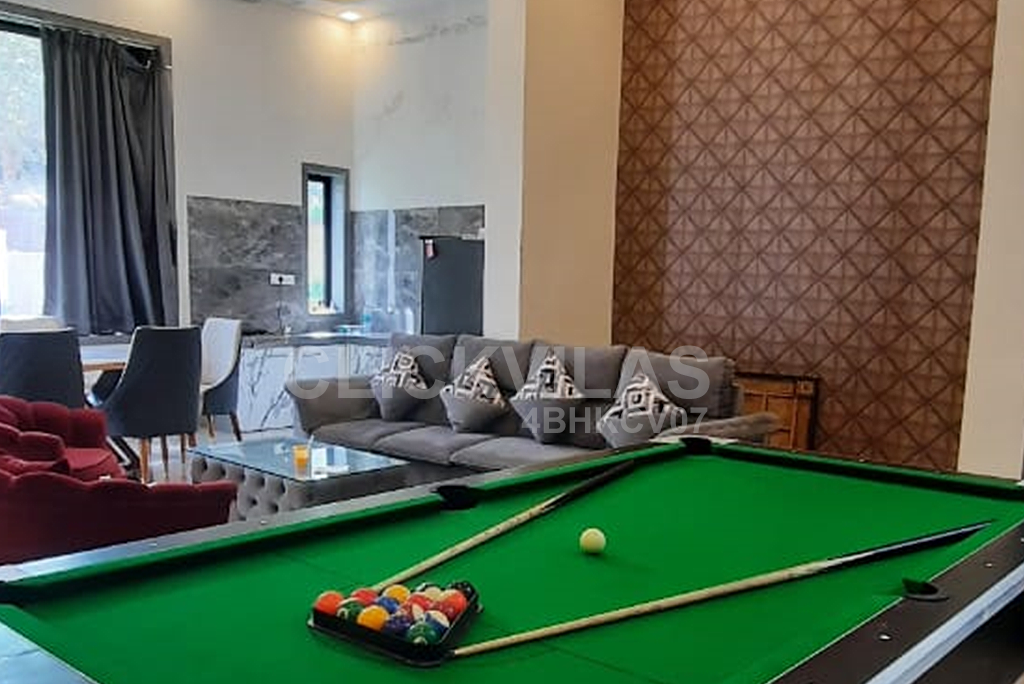 Escape to a serene four-bedroom bungalow in the picturesque hills of Lonavala, where comfort meets luxury. This spacious retreat features a private swimming pool, perfect for a refreshing dip amidst nature’s tranquility. Inside, you’ll find a well-equipped indoor games area, complete with a pool table for some friendly competition. Relax in the cozy living room, furnished with a large LED TV for your entertainment. Whether you’re lounging by the pool or enjoying a game night indoors, this bungalow offers the ideal setting for a memorable getaway.